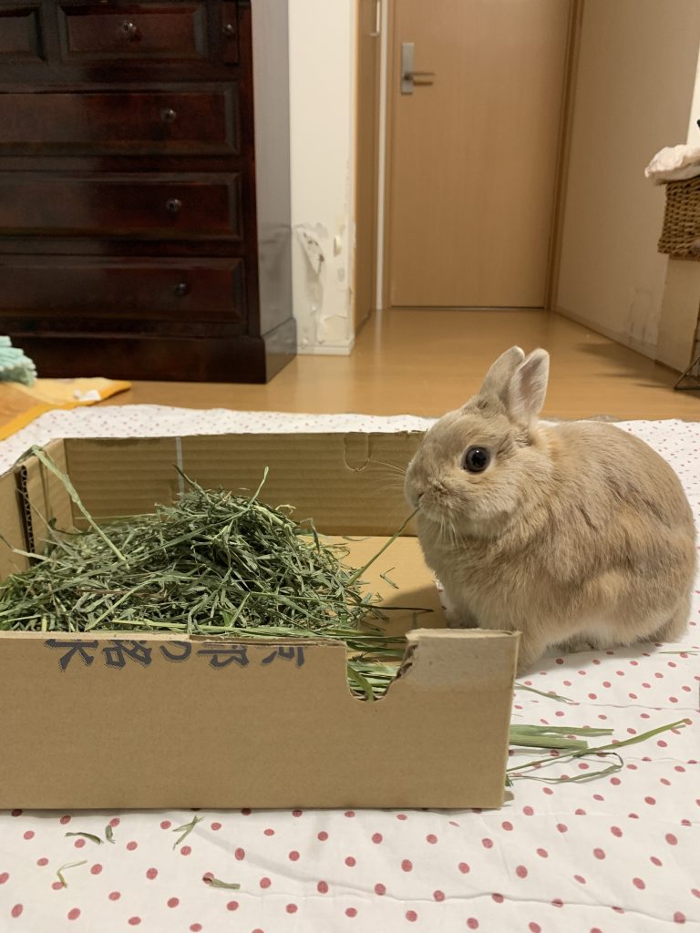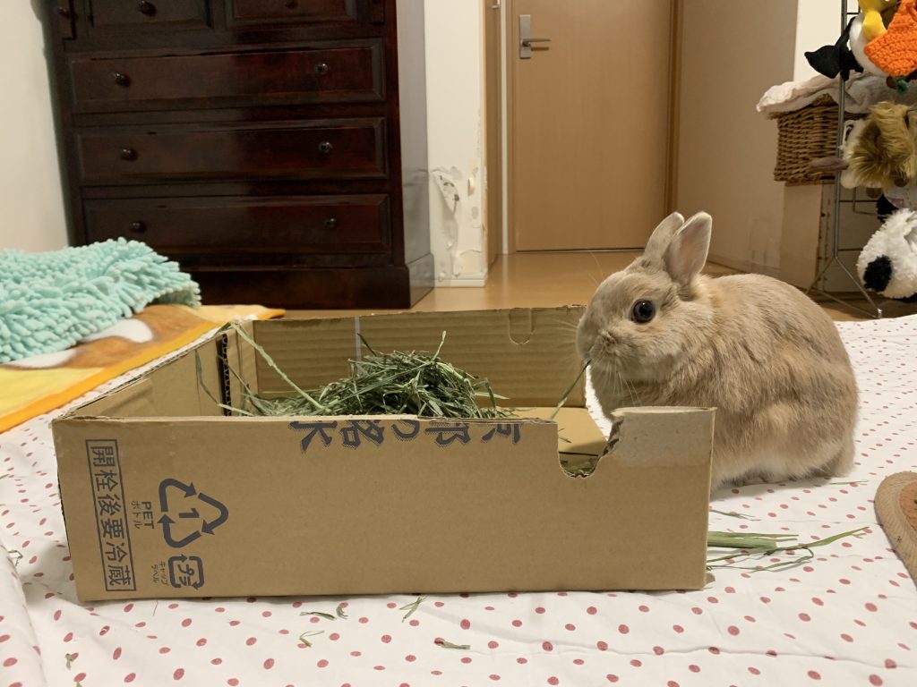 ダンボールのチモシー入れなかなかえぇで。なじみちゃん。