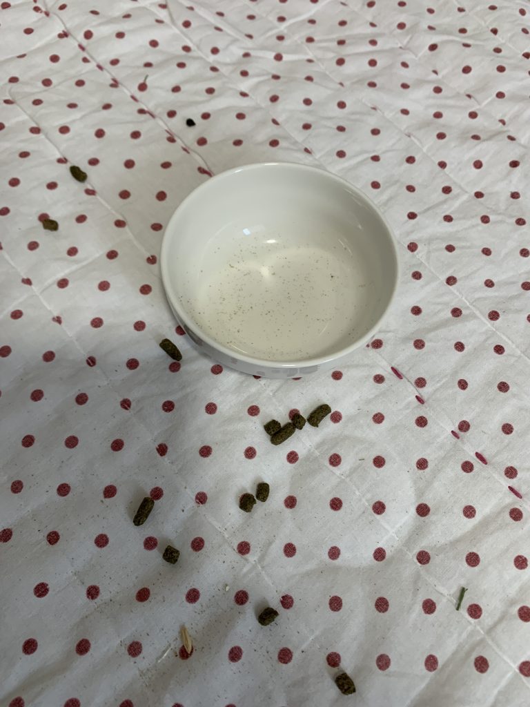 - ご飯が嬉しすぎて走り回ってご飯の入れ物蹴り飛ばして周りにペレットばら撒いたのに。