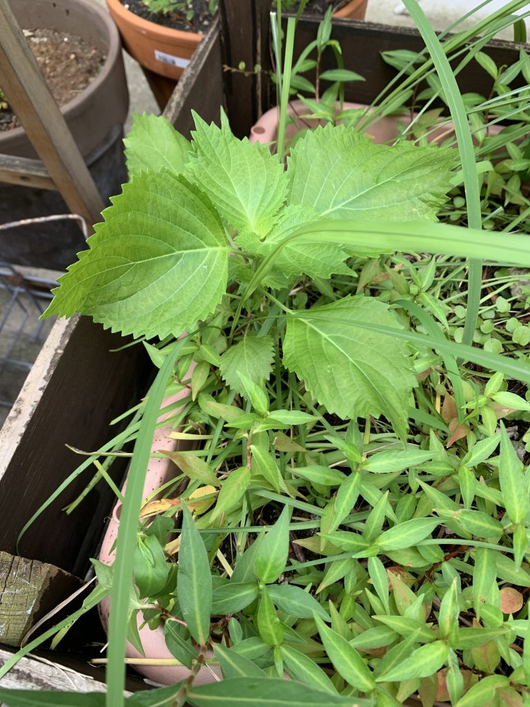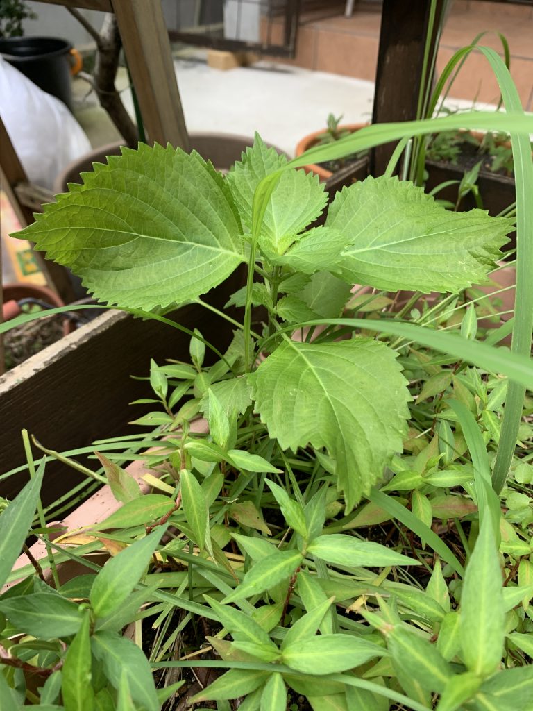 ベランダでじみのために丹精込めて育ててるハゲ散らかしてる大葉ちゃんの他に、庭のプランターに勝手に生えてきた大葉ちゃん。